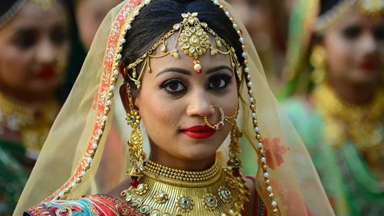 Традиционный красочный костюм (ярко-красный или белый цвет в приоритете) расшитый вышивками и монистами, высокий головной убор (вместо фаты) из дорогих тканей, украшенный золотом, серебром и драгоценными камнями отлично сочетается с легким и умеренным макияжем. Однозначный лайк!