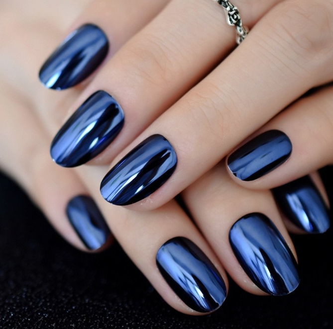 Тем, кто не любит яркий дизайн, отлично подойдет однотонный синий маникюр. Форма и длина ногтей не имеют значения, здесь уже все зависит от ваших предпочтений. Для более элегантного вида можно покрыть ногти матовым топом. Маникюр приобретет более нежный и женственный вид.