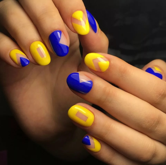 Попробуйте сочетание желтого и синего. Яркий желтый цвет в тандеме с глубоким синим заставляют мечтать о солнечных деньках. Такой союз смотрится свежо и новомодно, поднимает настроение. Попробуйте чередовать эти оттенки на ногтях, а на одном сделать акцент в виде цветка и страз. Получится интересный дизайн.