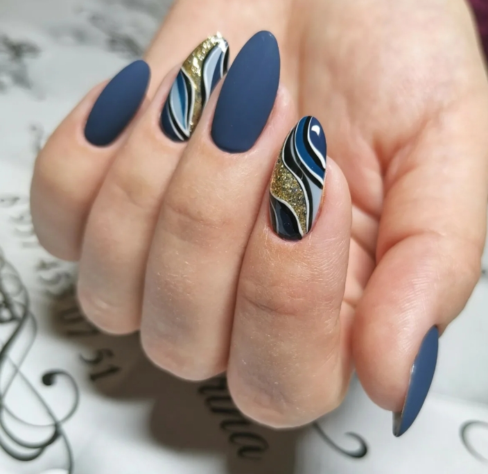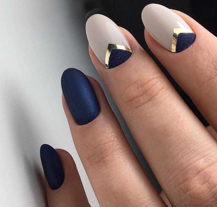 Матовый топ смотрится одновременно просто и шикарно. Покрытие напоминает бархат и придает женским рукам элегантный вид. В сравнении с глянцем такой дизайн имеет более лаконичный вид. В 2023 году стилисты советуют обратить внимание на цвет индиго.