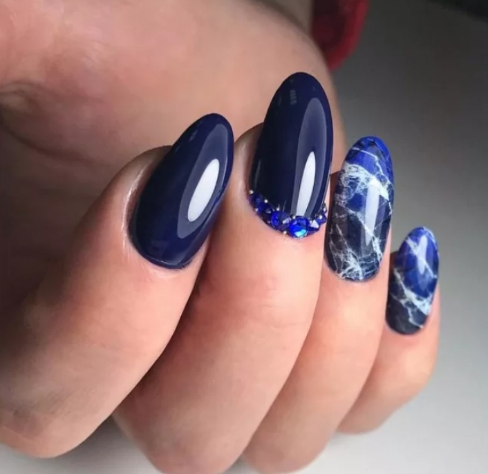 Для создания праздничного дизайна можно разбавить синий маникюр стразами, бусинками или камушками. Но на коротких ногтях их не должно быть много — лучше сделать акцент на одном или двух пальцах. Украшения можно выбирать любого цвета и формы. Из мелких элементов можно создать интересный рисунок или узор.