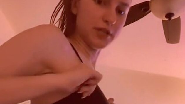 Девушка дополнила образ черной майкой из спандекса на широких бретелях, которая обтянула зону декольте. В ролике видно, что грудь юзерши кажется значительно больше, чем ранее.