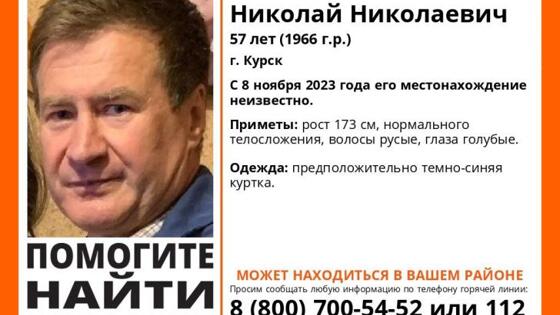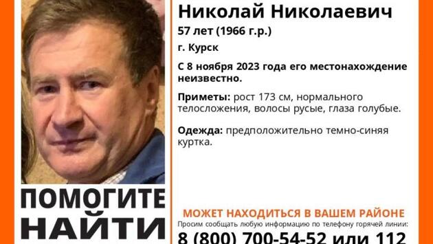 В Курске волонтёры ищут 57-летнего мужчину Пропал Славков Николай Николаевич. Он живёт в Курске. - С 8 ноября 2023 года его местонахождение неизвестно, - сообщают в поисковом отряде "ЛизаАлерт". Информацию о пропавшем можно оставить по телефону горячей линии отряда: 8 800 700 54 52 (бесплатно по РФ) или 112.