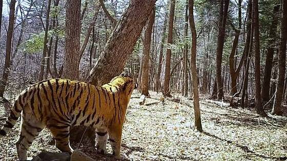 Ее котенок под номером Т 90M, часто попадает в объективы фотоловушек нацпарка, рассказали в заповеднике. На полученном видео специалисты заметили, как хищник тщательно обнюхивает дерево, но не для фотосессии. Он демонстрирует флемен — похожую на улыбку реакцию, с помощью которой животные усиливают приток воздуха в ротовую полость.