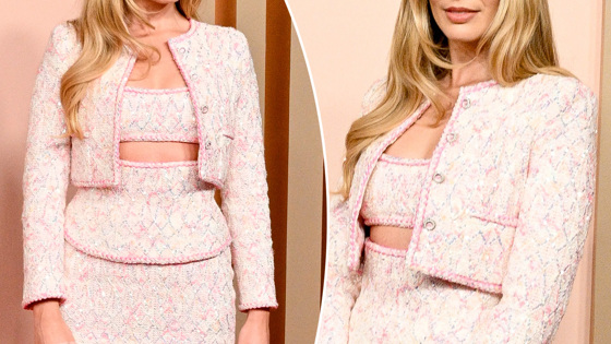 Для традиционного обеда номинантов на премию «Оскар» в Беверли-Хиллз Робби выбрала юбочный костюм-тройку из розового и белого твида. Образ состоял из бюстье с жакетом и мини-юбкой с высокой талией. Все три вещи были украшены серебряными блёстками с узором «аргайл». В роли аксессуаров Марго взяла сумочку из того же материала — маленькую, похожую на кукольную, с золотыми перекрещивающимися буквами «С» на крышке. Что касается обуви, то она выбрала сделанные на заказ туфли Manolo Blahnik: кремовые и с заострённым носком.
