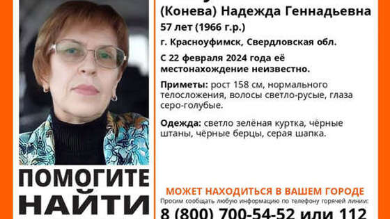 В Свердловской области пропала 57-летняя женщина в светло-зеленой куртке. Об этом сообщает поисковый отряд "ЛизаАлерт" Свердловской области. По информации поискового отряда, инцидент произошел в городе Красноуфимск. Местонахождение россиянки неизвестно с 22 февраля. Отмечается, что женщина может находиться в вашем городе. Пропавшая имеет нормальное телосложение, светло-русые волосы, серо-голубые глаза и рост 158 сантиметров. Сообщается, что россиянка была одета с светло-зеленую куртку, черные штаны и берцы, а также серую шапку. До этого в Петербурге 24-летний программист попрощался с родственниками и исчез. До этого он говорил родным, что не вернется домой.