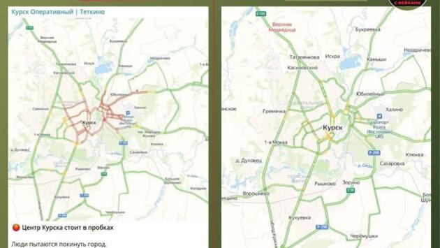В телеграм-канале "Война с фейками" сообщили, что в соцсетях распространяют фото с дорожной обстановкой и пробками. Создатели фейкового фото публикуют скрин с данными с ресурсов наблюдения за дорожной обстановкой, на котором якобы транспортные магистрали Курска "красные" из-за множественных пробок. - Вероятно, красные линии просто нарисовали в фотошопе, - уточнили в тг-канале.