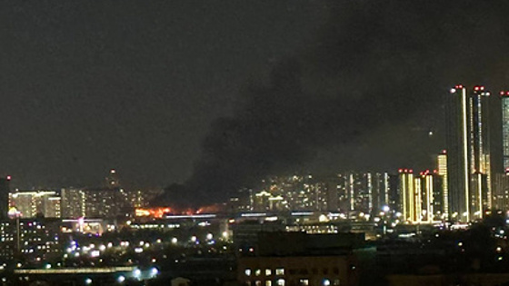 Кровля здания почти полностью объята огнем, происходит частичное обрушение. Поднимается столб черного дыма, запах гари чувствуется в соседних районах.