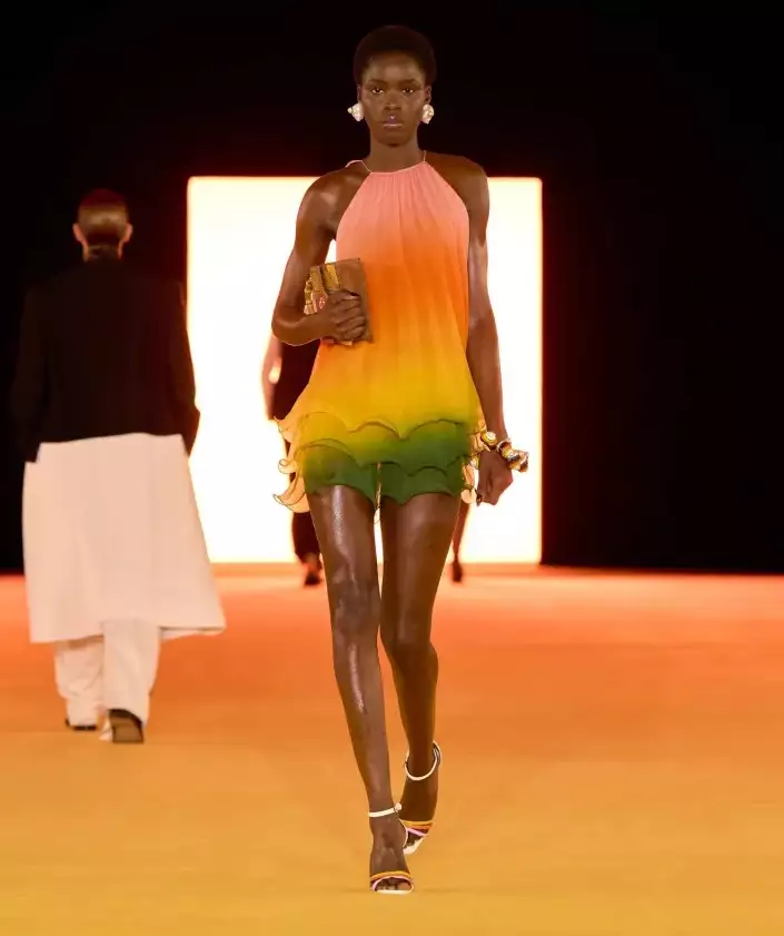 Кроме черного и белого в коллекциях весна-лето 2024 есть и яркие цвета: неоново-желтый, розовый, лазурный. Многие дизайнеры также не смогли определиться с одним оттенком омбре и показали всю палитру любимых цветов весны с помощью градиента. В Casablanca розовый, оранжевый, желтый и зеленый слились воедино на сетчатых платьях-майках на пуговицах и легких платьях. Mugler и Issey Miyake смешали менее очевидные сочетания оттенков оранжевого и синего, переходы которых покрыли облегающие костюмы.