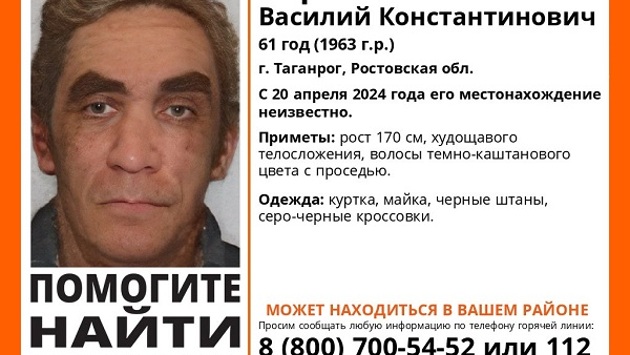 Ростовская область, 23 апреля 2024. DON24.RU. В Таганроге разыскивают 61-летнего Василия Борисова. Как сообщили в группе поискового отряда «ЛизаАлерт», с 20 апреля 2024 года его местонахождение неизвестно. Его приметы: рост 170 см, худощавое телосложение, волосы темно-каштанового цвета с проседью. Мужчина был одет в куртку, майку, черные штаны и серо-черные кроссовки. Сообщать любую информацию о его местонахождении просят по телефону горячей линии 8-800-700-54-52 или 112.