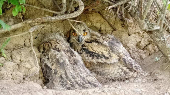 В Горшеченском районе Курской области обнаружили гнездование филина — одного из крупнейших сов, внесенного в Красную книгу России. Как утверждает автор находки Евгений Скляр, филины почти не встречалась в Курском регионе больше 100 лет. — Семья филинов обосновалась в небольшом овражке, в рытвине под корнями груши. Филины не строят гнезд, довольствуясь естественными укрытиями на земле типа расщелин, промоин, ветвей деревьев, корневых вывалов. И вот под этой самой грушей сидели два подросших птенца, скорее даже слетка, — говорит Евгений Скляр. Птенцы почти достигли размеров родителей, размер взрослого филина достигает 1,5 метров в размахе крыльев. Фото: Евгений Скляр