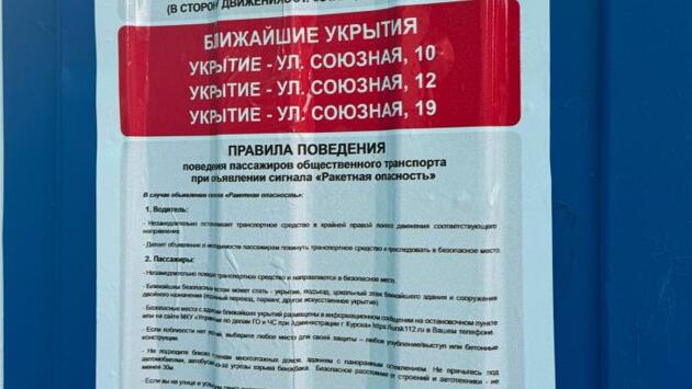 Напомним, при сигнале "Ракетная опасность" пассажиры обязаны покинуть общественный транспорт. В Курске, Курчатове и Железногорске на остановках общественного транспорта размещено более 300 памяток с указанием адресов укрытий. Помимо этого, в них содержится информация о действиях во время сигнала «Ракетная опасность» и телефоны экстренных служб. Памятки продолжат размещать на остановках.