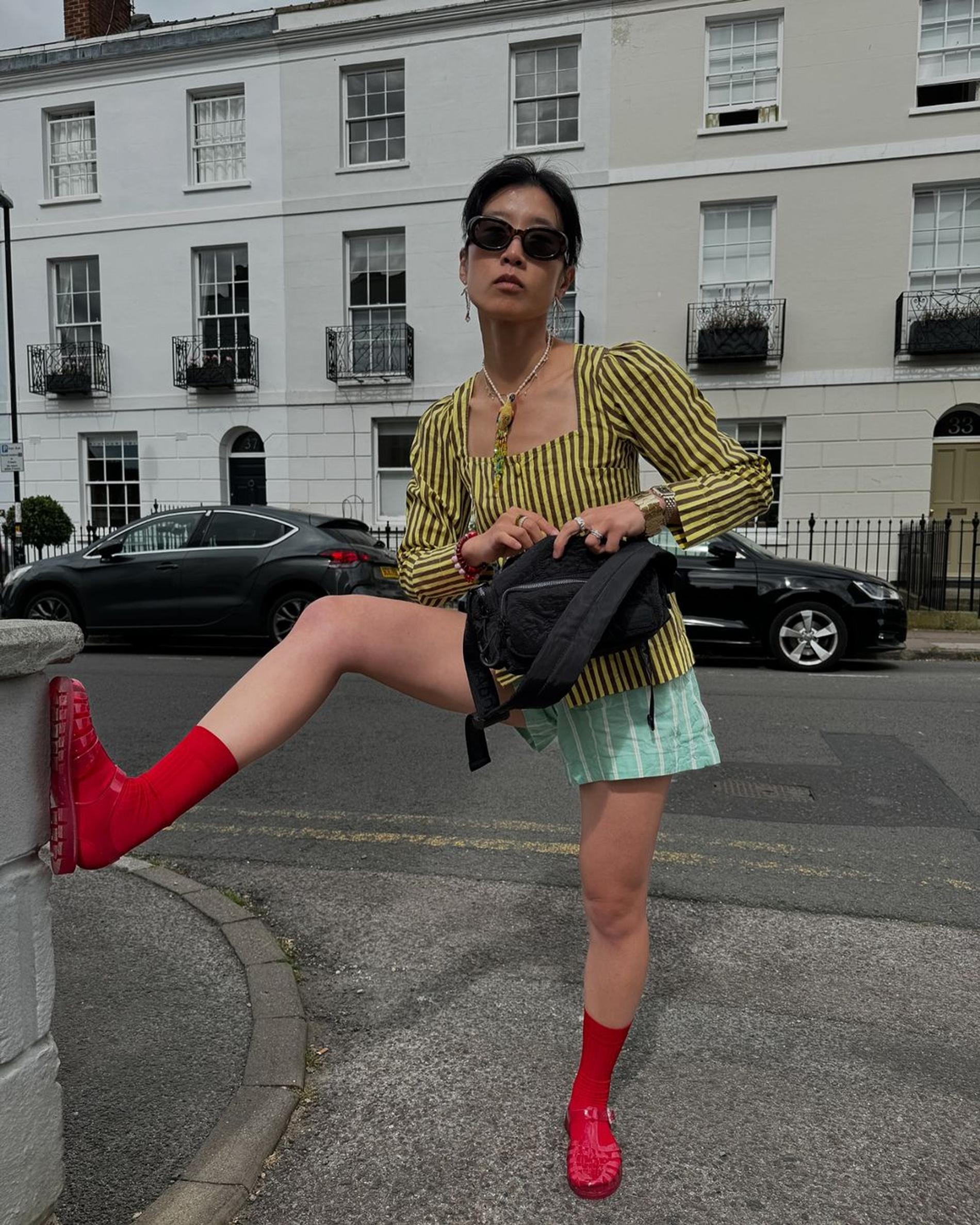 Летом на первый план вышли универсальные белые носочки. Как альтернатива — зачастую околоспортивная — белые с полосками или с надписями. Но и без ярких акцентов никуда. В качестве фэшн-трюка подбирайте носки под цвет сумки или другого аксессуара, а также в тон с обувью (такой прием визуально удлиняет ноги). Варианты с рисунками тоже как нельзя кстати, особенно романтические цветочки, которые отражают трендовые cottage core и coquette core.