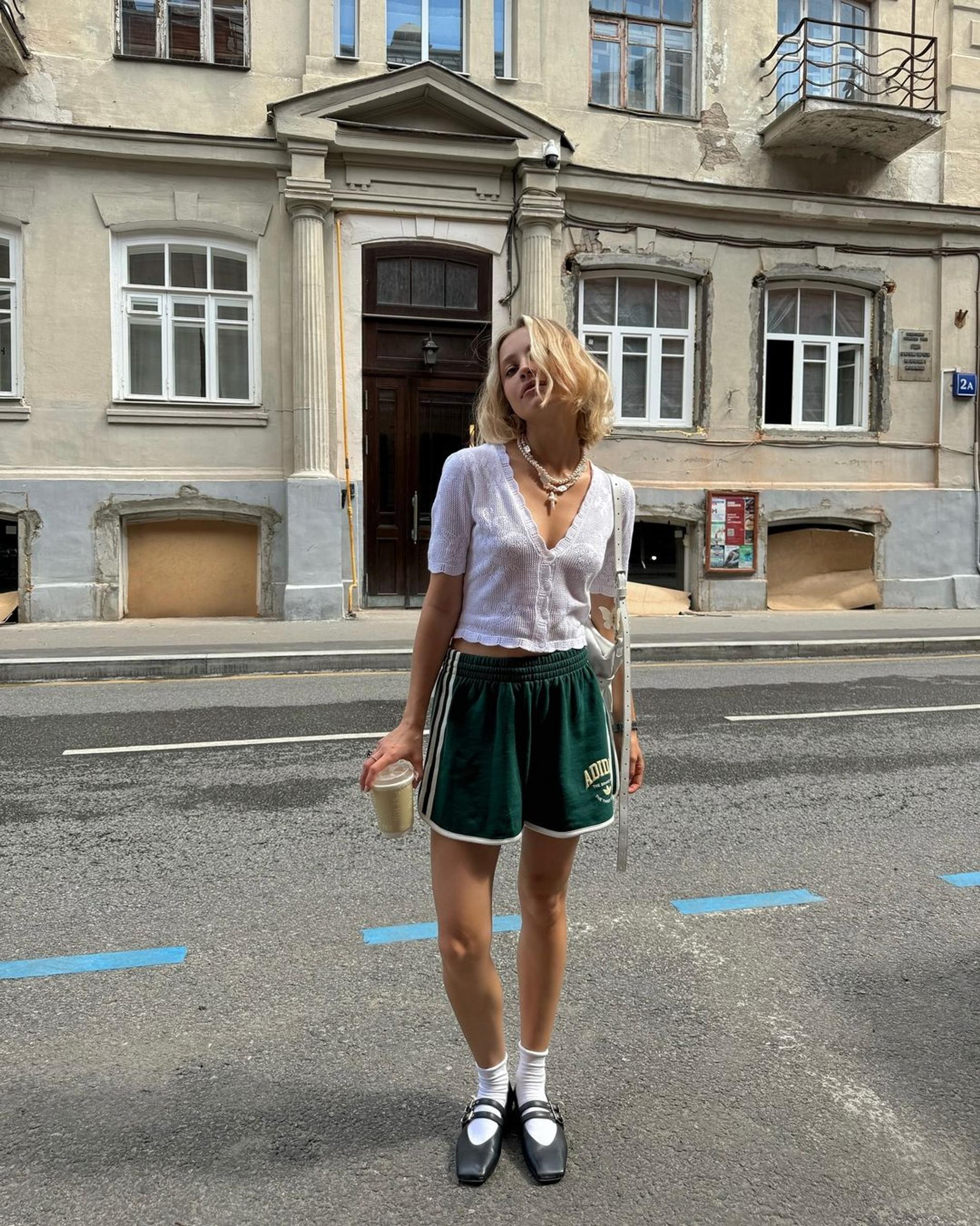 На первый взгляд кажется, что носки наиболее уместны в компании с короткими изделиями — с теми же пижамными шортами, юбками-плиссе, платьями-футболками. Как бы то ни было, миди-юбка (например, трендовая прозрачная) или платье в бельевом стиле тоже весьма благосклонны к носкам. Не говоря уже про джинсы и брюки. Ну и излюбленный прием модниц — натянуть спортивные носочки поверх леггинсов. Однако здесь стоит обратить внимание на собственный рост: невысоким девушкам такая стилизация может слишком сильно укоротить ноги.