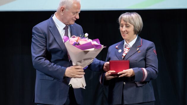 В Курске состоялся профессиональный праздник работников железнодорожной отрасли. Трудно найти человека, который не путешествовал бы на поезде, и День железнодорожника давно стал народным праздником. В парке собрались и взрослые, и дети. Здесь играл духовой оркестр, собравшиеся участвовали в конкурсах, викторинах, интерактивных играх, детей развлекали весёлые аниматоры. С профессиональным праздником железнодорожников поздравили руководители исполнительной и законодательной власти региона. Врио губернатора Курской области Алексей Смирнов подчеркнул, что перспективы региона напрямую связаны с развитием железнодорожной отрасли. – Курские железнодорожники занимают лидирующие позиции и по перевозкам пассажиров, и по перевозкам грузов. Высокие показатели будут не только сохраняться, но и расти, – сказал Алексей Смирнов. – С 1 июля в Курской области начала действовать свободная экономическая зона. Будут строиться предприятия, а это значит, что работы прибавится, а по железной дороге пойдут новые грузы. В этот непростой период мы вместе с железнодорожниками куём победу. Сейчас треть погрузки Московской железной дороги приходится на Курскую область. За первое полугодие перевезено более 21 миллиона тонн грузов. Уже второй год наш регион является лидером по перевозке зерна по всей стране. И санкции не помешали увеличить объём экспортных грузов. Председатель Курской областной Думы Юрий Амерев отметил, что во все времена, в кризисные периоды, железная дорога не останавливалась, спасая экономику и обороноспособность страны, перевозила пассажиров и грузы. Несмотря на сложность сегодняшних дней, в Курской области развиваются промышленность, сельское хозяйство – в том числе благодаря сотрудничеству с РЖД. – Российские железные дороги всегда были флагманом экономики. Продолжается большая работа по капитальному ремонту вокзалов, станций, пассажирских платформ, – сказал заместитель начальника Московской железной дороги Мухарбек Озиев. – В Курчатове появится первый в регионе модульный вокзал – современный транспортно-пересадочный узел. Время сложное, но железнодорожники решают все свои задачи и реализуют направленные на поддержку бизнеса и комфорт пассажиров проекты. На станции Курск в Центре продаж представителям бизнеса помогают выбрать наиболее выгодный и удобный вариант перевозки грузов. Пользуется популярностью маркетплейс «РЖД Маркет», на электронной площадке которого пользователи размещают свои предложения, находят покупателей или продавцов и сразу выбирают способ доставки груза железнодорожным транспортом. Для пассажиров предусмотрены туристические поездки с экскурсиями в разных городах. На торжественном собрании лучшим сотрудникам РЖД вручали ведомственные награды, почётные грамоты и благодарности губернатора Курской области, Государственной и Курской областной Думы, а также руководителей Донецкой и Луганской народных республик. Инженер первой категории Орловско-Курского регионального Центра связи Елена Будовская получила знак «За 20 лет безупречного труда на железнодорожном транспорте» и почётную грамоту от председателя правительства Донецкой Народной Республики Евгения Солнцева. – С начала СВО у нас был создан штаб помощи воинам, беженцам, жителям Донбасса. Мы закупаем и доставляем всё, 