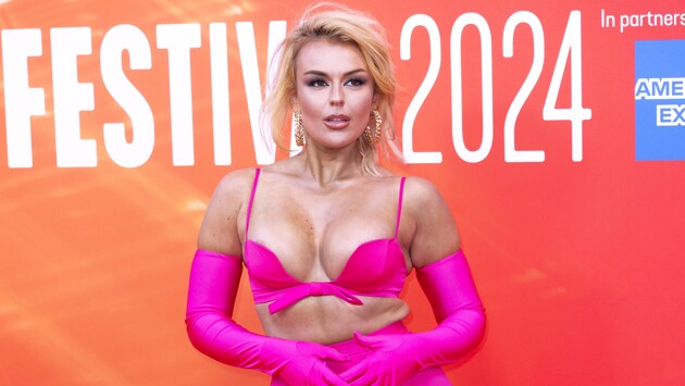 25-летняя исполнительница посетила премьеру фильма «Элтон Джон: никогда не поздно» в рамках Лондонского кинофестиваля BFI. Она предстала перед папарацци в ярко-розовом наряде, который состоял из макси-юбки, перчаток выше локтя и крошечного бюстгальтера на тонких бретелях и с глубоким вырезом. При этом бра сползло с груди знаменитости, обнажив часть ареол.
