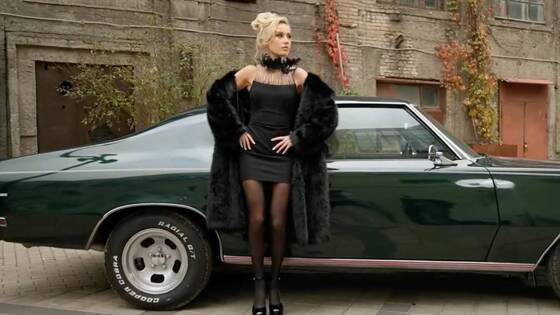 28-летняя исполнительница предстала на размещенных кадрах выходя из автомобиля в черном наряде. Она надела облегающее мини-платье, украшенное перьями и прозрачные колготки, а также шубу и туфли на массивной платформе и каблуках.