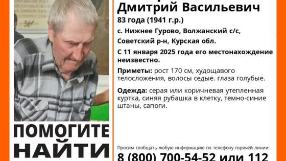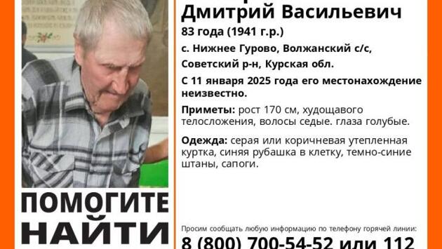 С 11 января его местонахождение неизвестно. 83-летний житель села Нижнее Гурово Советского района Смотров Дмитрий Васильевич пропал 11 января. Его приметы: рост 170 см, худощавого телосложения, волосы седые. глаза голубые. Был одет в серую или коричневую утепленную куртку, синюю рубашка в клетку, темно-синие штаны, сапоги. Сообщить информацию о нем можно по номеру 112, либо на горячую линию отряда 8-800-700-54-52. Также в поисковом отряде "Лиза Алерт" объявлен сбор добровольцев на поиски пожилого мужчины. Сбор в 17.00 в селе Нижнее Гурово. Подробности в группе <a href="https://t.me/lizaalertkursk">волонтеров</a>.