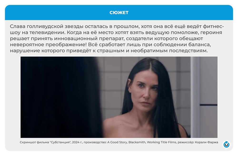 Вы когда-нибудь мечтали стать лучшей версией себя? Это главный слоган фильма "Субстанция" (18+), который прошлом году вышел на большие экраны. Боди-хоррор совместного производства Франции, Великобритании и США.