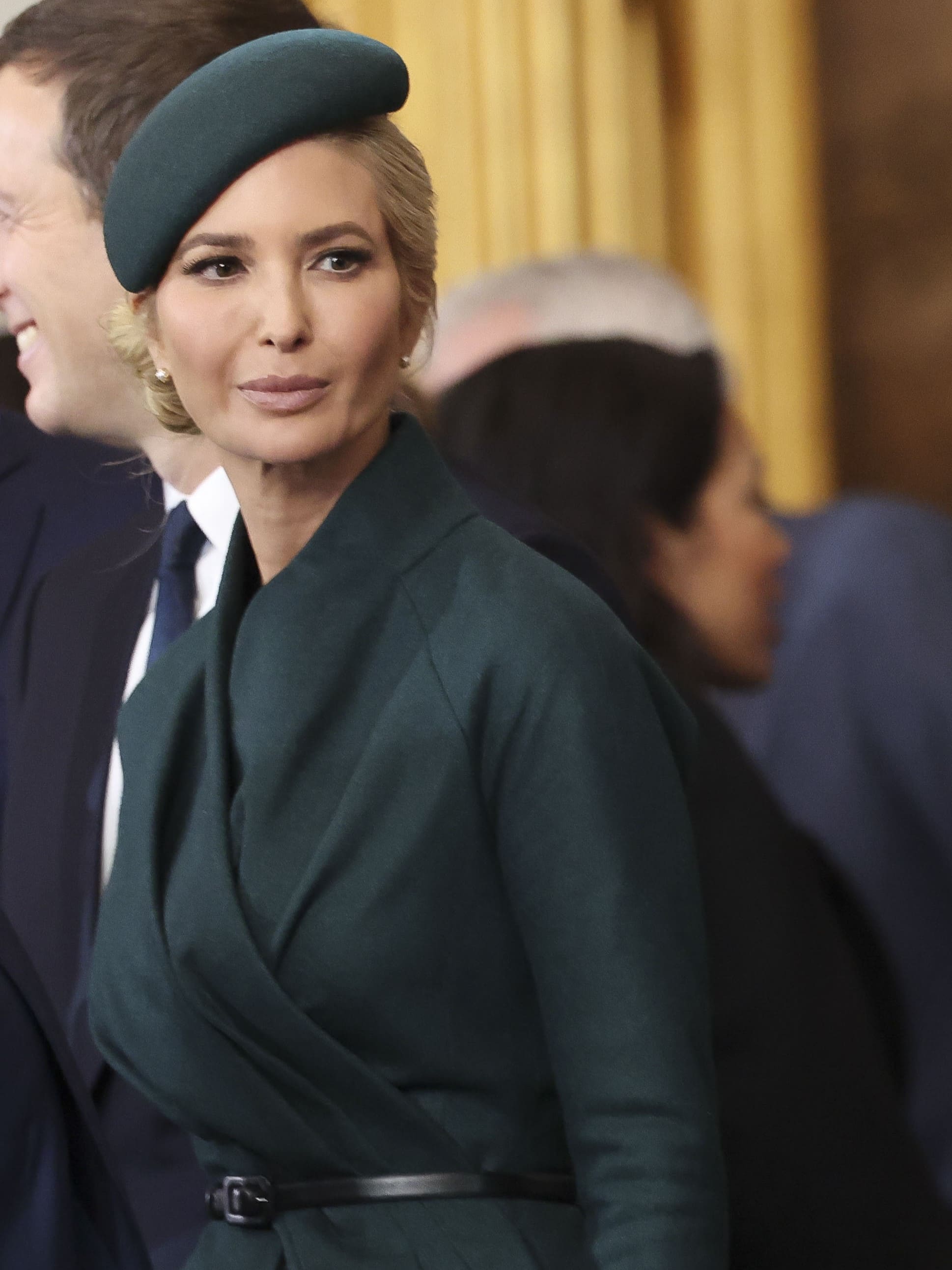 Старшая дочь президента Иванка Трамп появилась на второй церемонии инаугурации своего отца в трендовой шляпке-таблетке и шерстяном костюме цвета хвойного леса, созданном не американским, а французским модным домом. Юбку-карандаш длины миди, асимметричный жакет с запахом и драпировкой и шляпку Dior дополняла черная сумочка того же бренда.