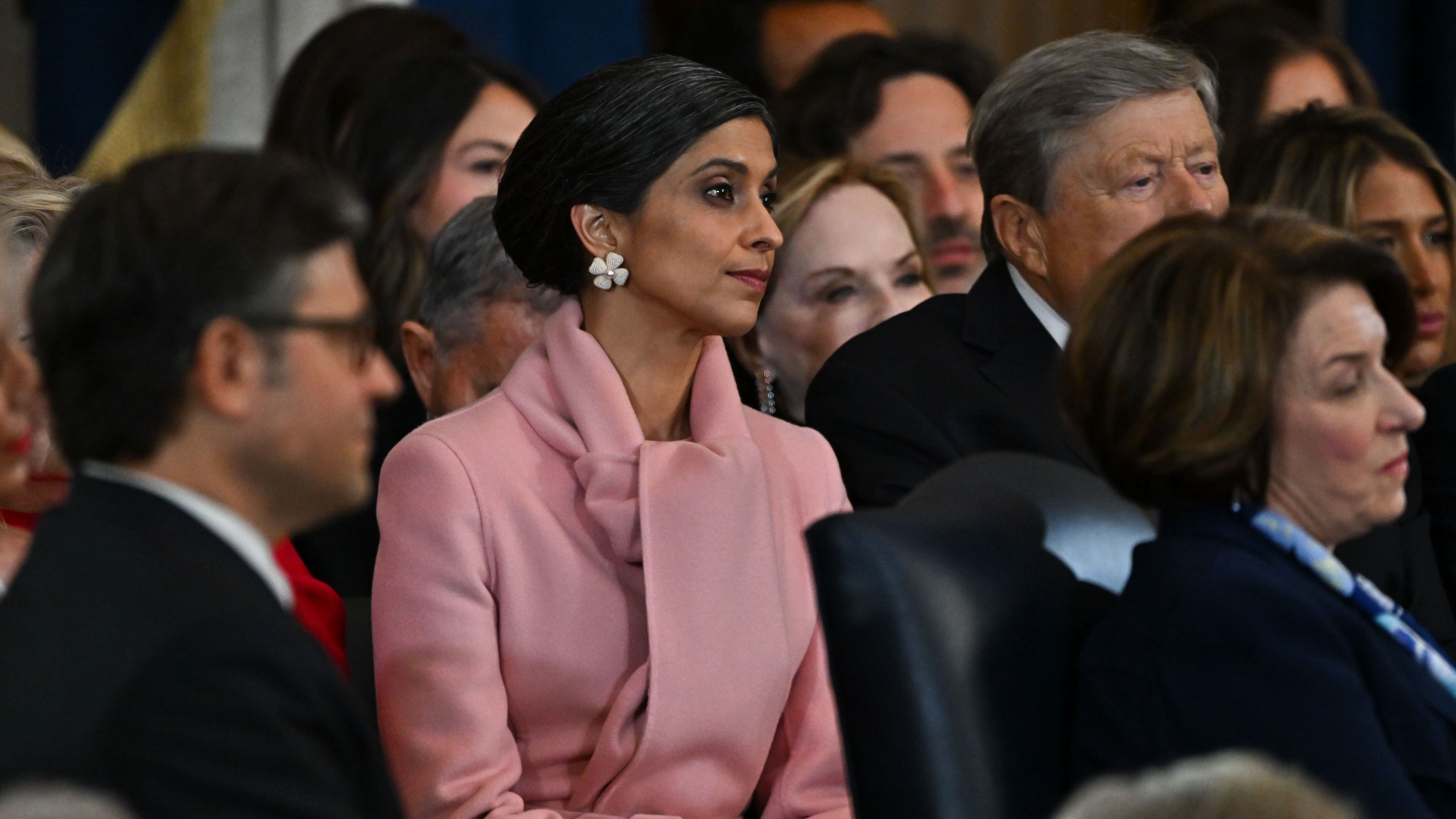 Супруга вице-президента США Уша Вэнс выбрала для церемонии инаугурации наряд, который заставил вспомнить об иконе стиля американской политики — супруге Джона Ф. Кеннеди Жаклин, с которой ассоциируется нежно-розовый цвет. Кашемировое пальто кораллового оттенка, созданное модным домом Oscar de la Renta, структурировал тонкий пояс, а аксессуаром послужил шарф в тон. Наряд дополнили замшевые перчатки цвета мокко и замшевые сапоги Manolo Blahnik того же оттенка.