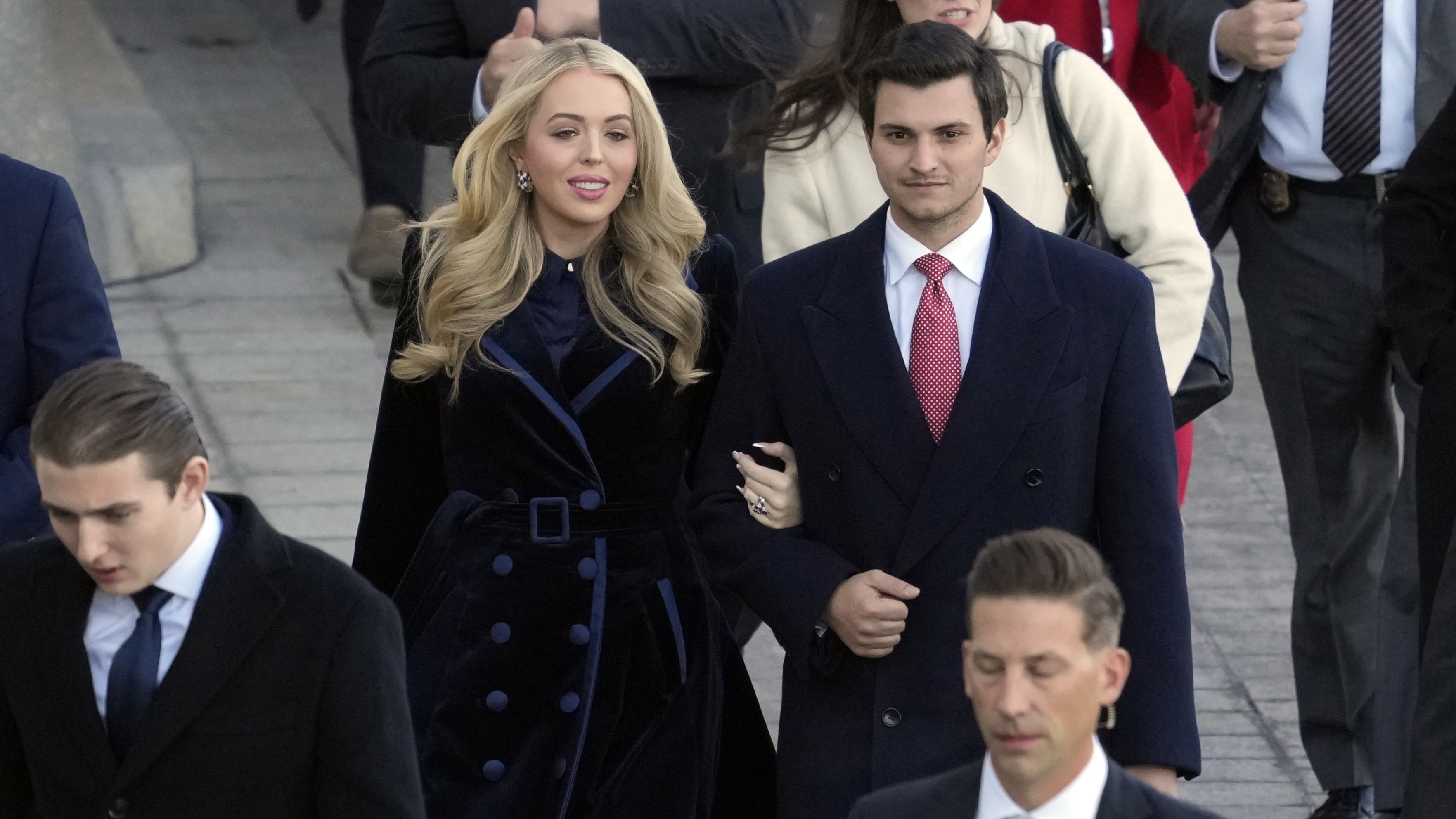 К слову, оттенок синего выбрала для церемонии и дочь Дональда Трампа Тиффани. Она появилась в бархатном наряде цвета сапфира: платье-пальто было подчеркнуто поясом, но весьма свободно — вероятно, потому, что 31-летняя Тиффани и ее муж Майкл Було ожидают первенца.