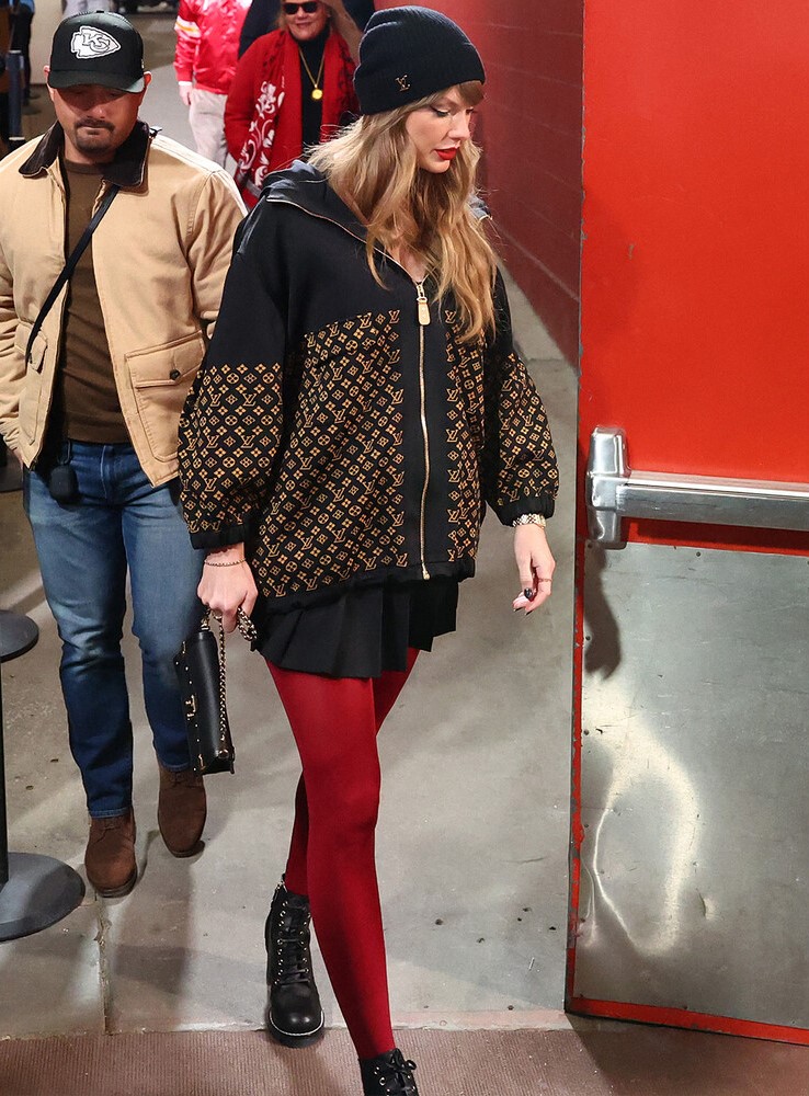 Тейлор Свифт заметили на футбольном матче, в котором сыграла команда «Канзас- Сити Чифс» против «Баффало Биллс». Певица пришла на мероприятие, чтобы поддержать своего бойфренда Трэвиса Келси. Артистка была одета в наряд от бренда Louis Vuitton, общая стоимость которого превысила $10 200. Поп-исполнительница выбрала черно-золотую жаккардовую куртку с монограммой за $5000, плиссированную мини-юбку, красные колготки, ботильоны на каблуках за $1800, шапку за $550 и сумку за $2850. Знаменитость распустила волосы и сделала макияж с черными стрелками и красной помадой.
