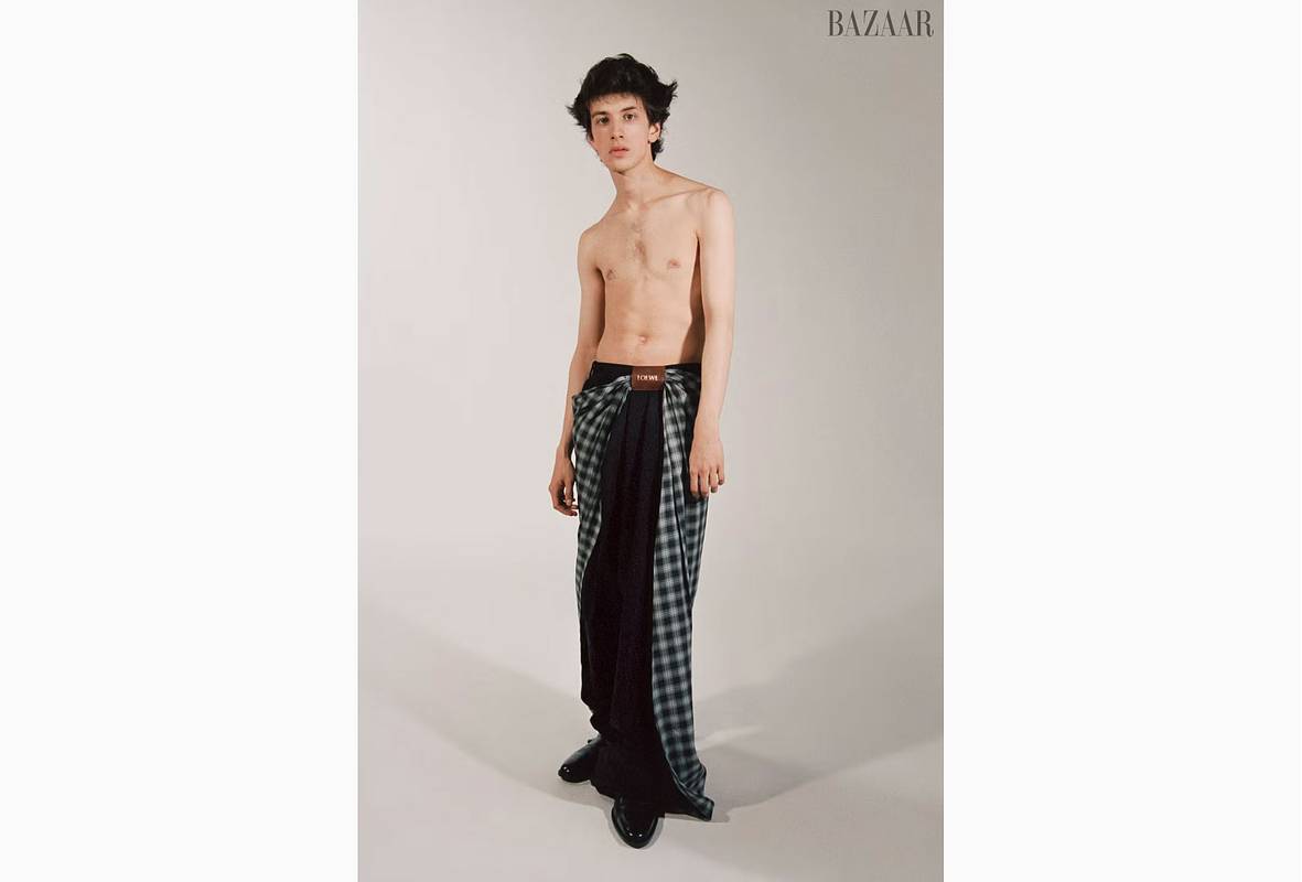 22-летний актер, прозванный в соцсетях и СМИ «русским Тимоти Шаламе» (Шаламе — известный американский и французский актер), предстал на размещенных кадрах с обнаженным торсом. Звезда «Аноры» позировал перед камерой в черных брюках с клетчатой драпировкой и лакированных туфлях из ассортимента люксового бренда Loewe.
