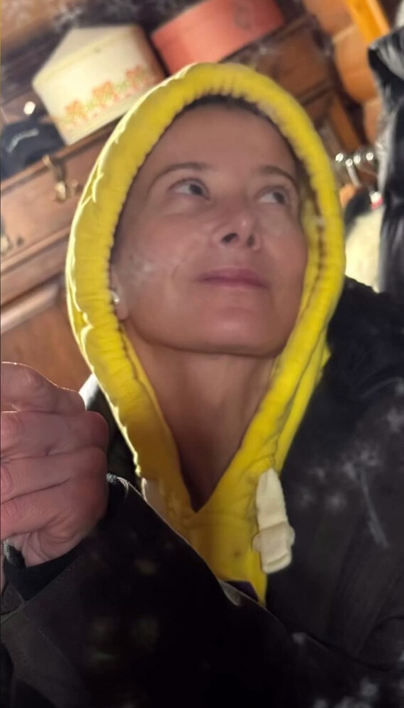 51-летняя Юлия Высоцкая позировала в черном пуховике и желтом худи, убрав волосы под капюшон. Телеведущая без макияжа стояла перед зеркалом в доме.
