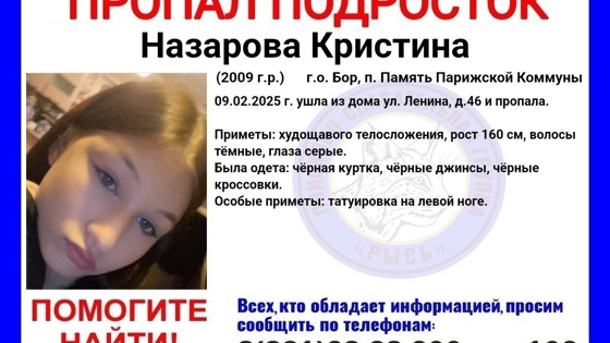 15-летняя девушка с татуировкой пропала в Борском округе Нижегородской области, сообщает поисково-спасательная группа «Рысь». Она ушла из дома на улице Ленина, 46 в поселке Память Парижской Коммуны в воскресенье, 9 февраля, и пропала. Ее приметы — худощавое телосложение, рост 160 см, темные волосы и серые глаза. Особая примета — татуировка на левой ноге. В день исчезновения девушка была одета в черные куртку, джинсы и кроссовки. «Всех, кто обладает информацией, просим сообщить по телефонам: 8(831)28 – 38-200 или 102», — говорится в сообщении. UPD: Найдена, жива.