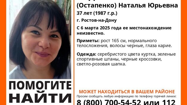 Ростовская область, 10 марта 2025. DON24.RU. В Ростове разыскивают 37-летнюю Наталью Радченко. С 6 марта 2025 года ее местонахождение остается неизвестным, сообщили в поисковом отряде «ЛизаАлерт» Ростовской области. Ее приметы: рост 165 см, нормальное телосложение, черные волосы и карие глаза. Женщина была в серебристой куртке, зеленых штанах, черных кроссовках и светло-розовой шапке. Сообщать любую информацию о местонахождении пропавшей просят по телефону горячей линии 8-800-700-54-52 или в «Службу-112». Ранее писали, что в феврале в Ростовской области пропали 50 человек.