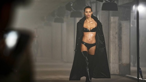 Одна из моделей традиционно вышла на подиум без бюстгальтера в черном прозрачном платье. Тренд на мех, как и на нарочитую сексуальность, перекочевал и в 2025 год — дизайнеры декорировали изделие меховой отделкой на подоле и надели модели на шею накидку из такого же материала.