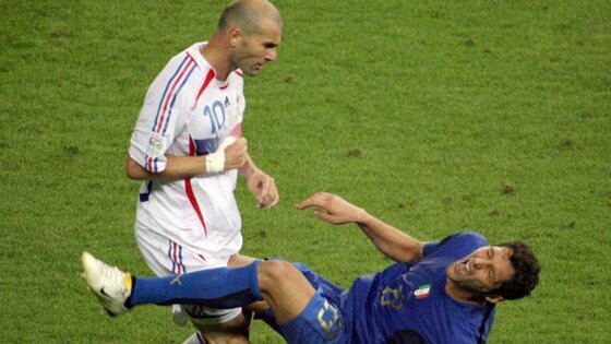 В финале ЧМ-2006 полузащитник сборной Франции Зинедин Зидан ударил защитника сборной Италии Марко Матерацци головой в грудь, отреагировав на провокацию со стороны соперника. Зидан получил красную карточку, сборная Италии выиграла матч (1:1, пен. 5:3).