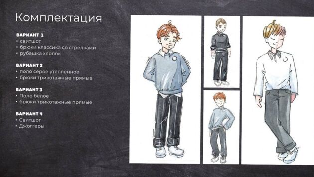 В основе ее концепции — мягкий деловой стиль. По ее мнению, он настроит школьников на работу, но при этом не будет сковывать движения и создавать дискомфорт. Дизайнер также учла и тот момент, чтобы предметы одежды можно было легко сочетать друг с другом и создавать разные образы.