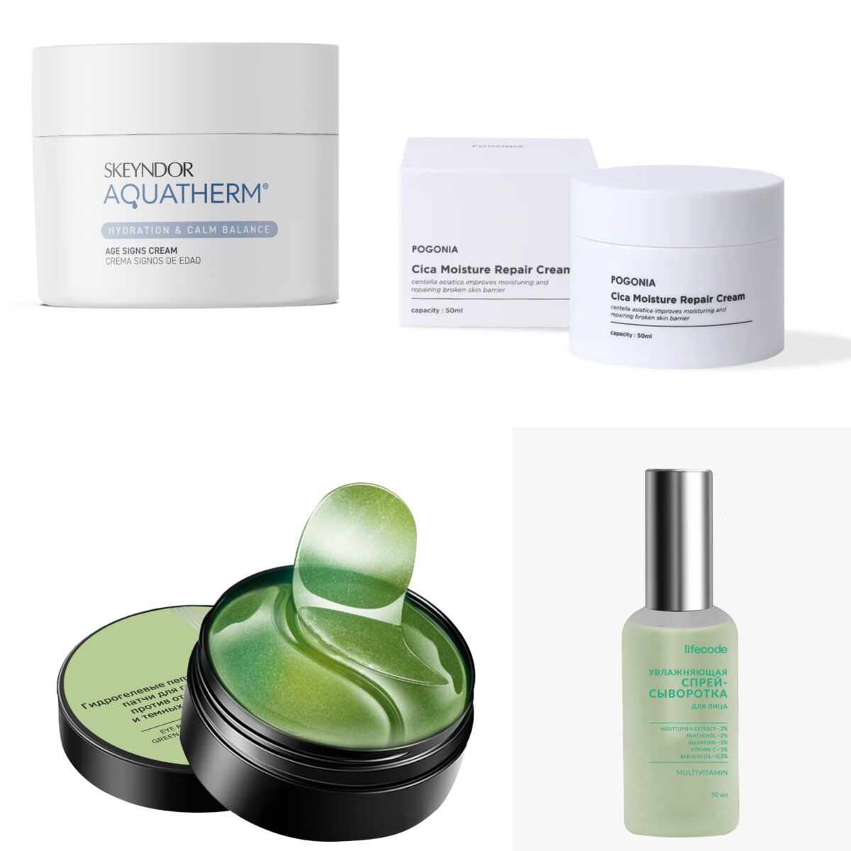 На фото представлены: успокаивающий и снимающий раздражения крем для лица Aquatherm skeyndor sos relieving cream; крем для лица Aquatherm Age Signs cream; шампунь, кондиционер и гель-стайлинг для волос «Кудрявый метод» Сакура; Увлажняющий гель для душа парфюмированный Шаматха Pravilnaya Kosmetika; очищающая пенка для интимной гигиены Белая лилия и клевер Pravilnaya Kosmetika; гидрогелевые пептидные патчи для глаз с экстрактом зеленого чая Lifecode; Спрей сыворотка мультивитаминная Lifecode; крем для лица Pogonia Cica Moisture Repair Cream с центеллой азиатской; гель – лак Bubble Bubble от Bandi.