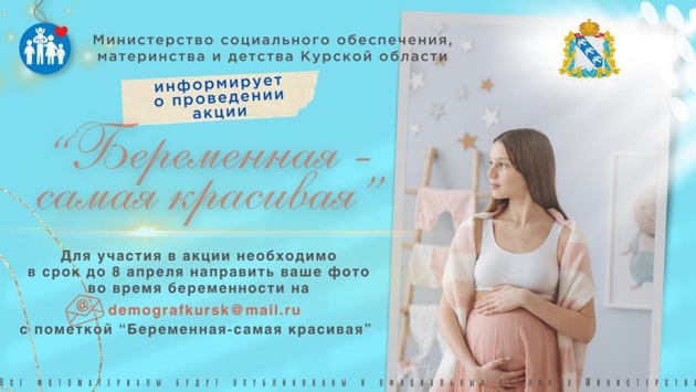 Министерство социального обеспечения, материнства и детства Курской области запускает акцию «Беременная — самая красивая». Женщины, ожидающие пополнения в семье, могут до 8 апреля отправить свои фотографии по электронной почте: demografkursk@mail.ru, указав в теме письма «Беременная — самая красивая». Фотографии будут опубликованы в социальных сетях Министерства. Актуальные новости региона в нашем Telegram-канале PROKursk и соцсетях «ВКонтакте» и «Одноклассники»