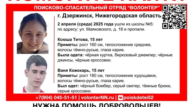 15-летних Ксюшу Титову и Ваню Кожокаря разыскивают в Дзержинске. Об их местоположении ничего не известно со 2 апреля, сообщает поисково-спасательный отряд «Волонтер». 2 апреля оба подростка ушли из школы №5 на улице Маяковского в Дзержинске и пропали. Девочка имеет рост 160, среднее телосложение, темно-русые волосы и карие глаза. В момент пропажи она была одета в черную куртку, бирюзовый джемпер, черные джинсы и черные кроссовки. Мальчик имеет рост 180, худощавое телосложение, темно-русые волосы и карие глаза. В момент пропажи он был одет в черный бомбер, серый свитер, темные брюки и серые кроссовки. Если у вас есть какая-либо информация о местонахождении этого человека, пожалуйста, позвоните на горячую линию отряда ПСО «Волонтер» 8-(831) 291 – 51-51 или инфоргу поиска: +7 – 910-393 – 05-08 Мария (Мелисса).