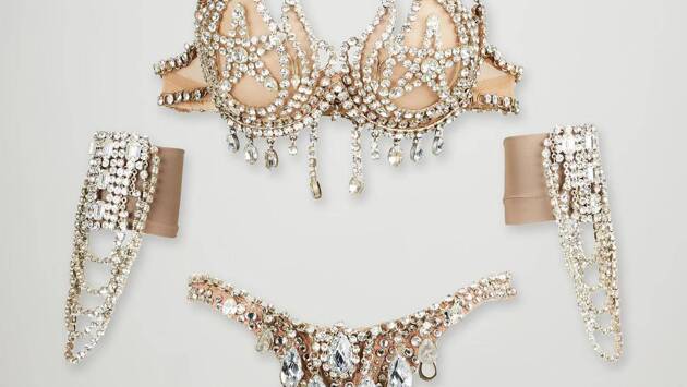 Участникам торгов предложили к покупке бежевый сценический наряд, состоящий из бюстгальтера и трусов, декорированных многочисленными стразами разной величины и формы. В комплект также вошли нарукавники из аналогичного материала.