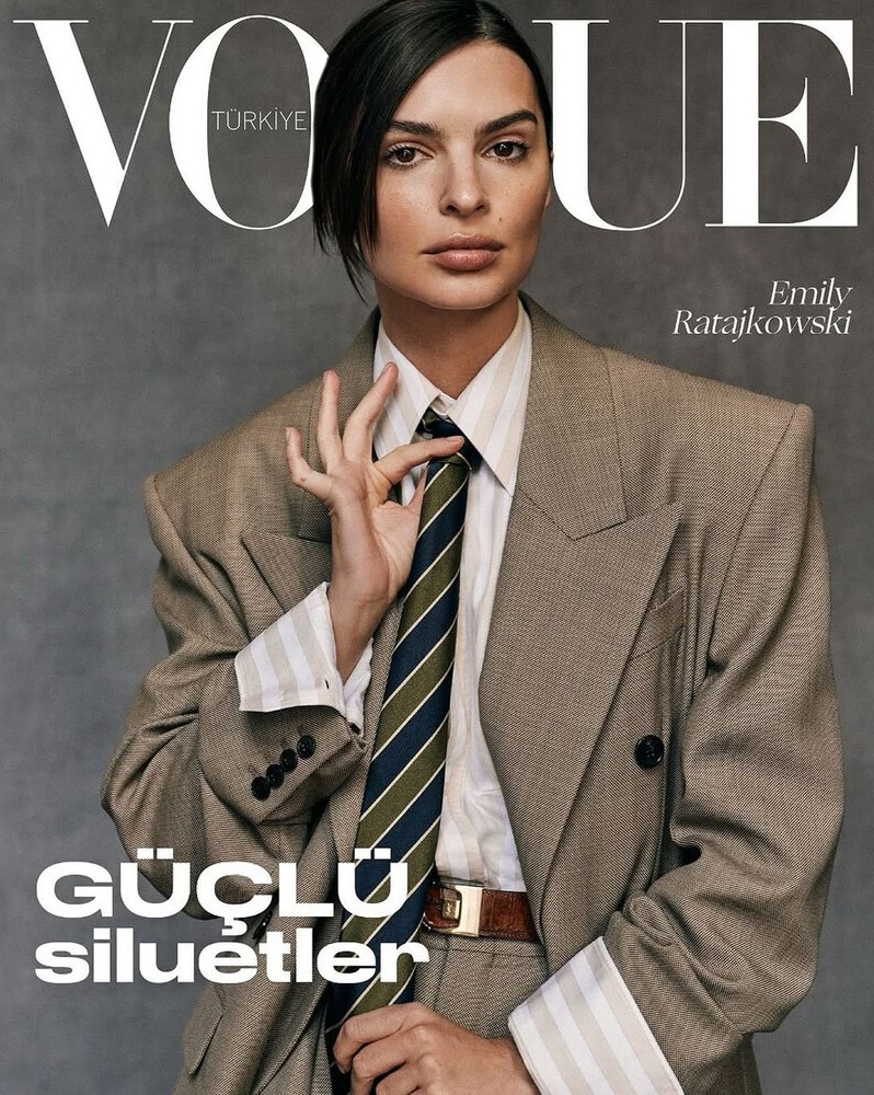 Эмили Ратаковски позировала в коричневом мужском костюме, белой рубашке, коричневом ремне и пестром галстуке. Волосы ей собрали в низкий пучок и выпустили передние пряди, а также сделали легкий дневной макияж.