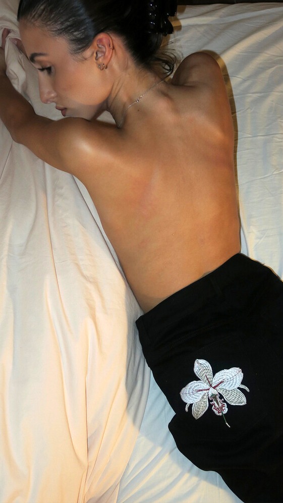 Родственница звезды собрала волосы в пучок и надела тонкую цепочку серебряного цвета. На снимке видно, что она лежит на кровати спиной к камере.