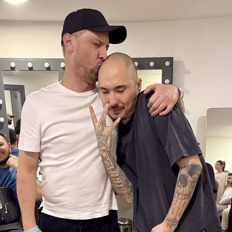 На размещенном снимке знаменитости позировали, стоя рядом. Музыканта запечатлели в темно-серой оверсайз-футболке и мешковатых голубых джинсах. Также он продемонстрировал обритую налысо голову.