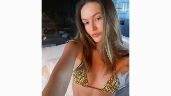 30-летняя манекенщица поделилась селфи, на котором позировала в крошечном коричневом бикини с принтом в виде звеньев цепи. Комплект состоял из топа с треугольными чашками и V-образных трусов с завязками на бедрах.