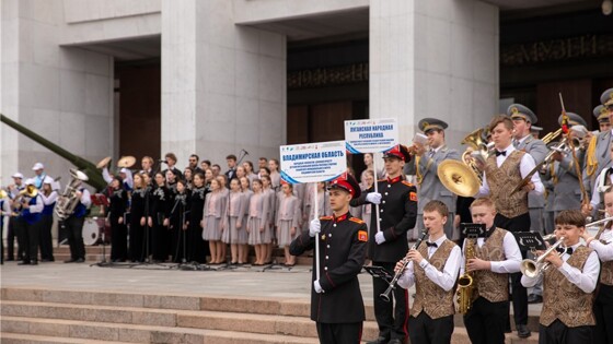 Более 600 юных музыкантов из разных регионов России, включая новые российские территории объединились в сводный оркестр и выступили в Музее Победы в рамках музыкально-просветительского проекта «Сильные духом!», организованного Ассоциацией «Духовое общество имени Валерия Халилова» при поддержке Министерства культуры Российской Федерации. Концерт состоялся в День России и стал центральным событием трёхдневной культурной программы проекта. Проект реализуется с использованием гранта, предоставленного ООГО «Российский фонд культуры» в рамках федерального проекта «Семейные ценности и инфраструктура культуры» национального проекта «Семья». Атмосфера у колоннады Музея Победы в этот день была особенно торжественной — этому способствовало массовое совместное выступление духовых коллективов из Москвы, Донецкой и Луганской Народных Республик, Белгородской, Курской, Калужской, Владимирской и Московской областей. Оркестры выступили как единый организм — в одном ритме и звучании. Вместе с ними в концертной программе приняли участие хоровые и хореографические коллективы, с дефиле выступил ансамбль барабанщиков. Концерт начался с исполнения Государственного гимна Российской Федерации. Далее в программе прозвучали патриотические произведения, песни о Родине, сочинения Михаила Глинки, Сергея Прокофьева, Исаака Дунаевского. «Сила духа рождается там, где есть музыка, взаимное уважение и ощущение плеча рядом. В День России это особенно чувствовали сами дети — когда, играя вместе, они становились одним целым, несмотря на то, что приехали из разных уголков нашей любимой страны», — подчеркнул художественный руководитель проекта, президент Российского духового общества, заслуженный деятель искусств РФ Михаил Брызгалов. Перед концертом состоялась репетиция, ставшая первой встречей для большинства участников. Несмотря на то, что музыканты ранее не выступали вместе, им удалось быстро сыграться. По словам организаторов, сказался высокий уровень подготовки: в оркестрах играли как старшие школьники, ученики творческих вузов и колледжей, так и совсем юные исполнители — самому младшему участнику сводного оркестра всего восемь лет. К участию в проекте были приглашены лучшие детско-юношеские духовые оркестры страны. Завершился концерт сольными номерами оркестров: выступили музыканты из ДНР, ЛНР, Белгорода и Курска. Программа проекта «Сильные духом!» стартовала 11 июня выступлениями духовых оркестров на открытой площадке у Российского национального музея музыки. Также участники смогли познакомиться с Москвой, посетить экскурсии по экспозициям Музея Победы и Музея музыки, принять участие в тематических встречах. Для некоторых ребят это было первое знакомство со столицей. Центральным событием просветительского блока стала лекция генерального директора Музея музыки, президента Российского духового общества Михаила Брызгалова, посвящённая истории фронтовых музыкальных коллективов времён Великой Отечественной войны.