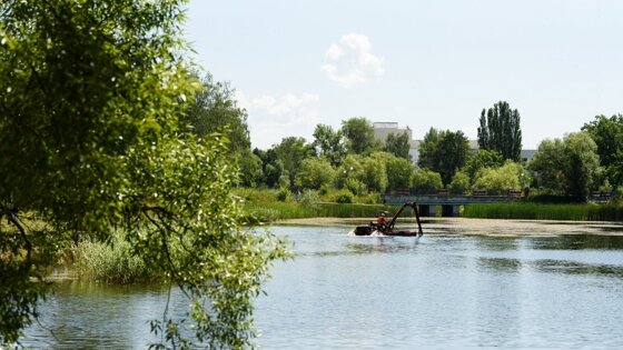 С помощью земснаряда затем углубят дно водоема. В дальнейшем аналогичную работу проведут на остальных прудах.