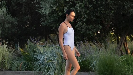 40-летняя звезда фильма «Чудо-женщина» предстала на размещенном фото во время отдыха у бассейна. Она позировала с распущенными волосами в слитном белом купальнике с черной окантовкой, тонкими бретелями и вырезами на спине.