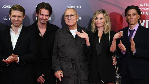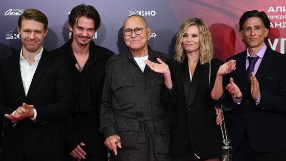 Пара посетила кинопремьеру «Хроники русской революции». 52-летняя Высоцкая выбрала для красной дорожки черный пиджак и белый галстук. Кроме того, она надела мини-платье, капроновые колготки и остроносые туфли. Эффектный образ артистки завершили небрежная прическа, яркий макияж и сумка в виде стеклянного флакона.