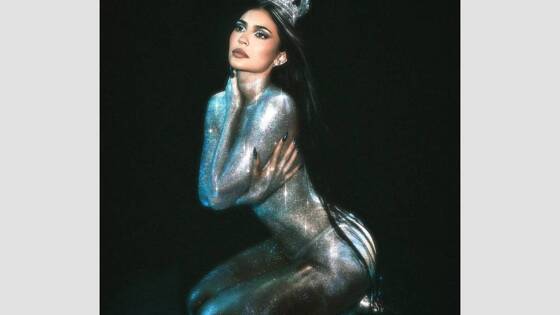28-летняя манекенщица презентовала новую коллекцию своего бренда косметики Kylie Cosmetics под названием King Kylie. Она предстала перед камерой в одних трусах, покрыв обнаженное тело блестками голубого оттенка.