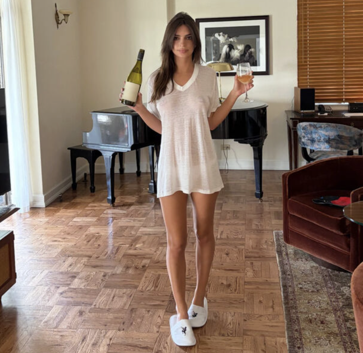 Эмили Ратаковски предстала перед камерой в белой футболке, под которую не стала надевать бюстгальтер. Модель позировала в трусах и тапках. Манекенщица была запечатлена с распущенными волосами и без косметики. Актриса держала в руках бутылку и бокал.
