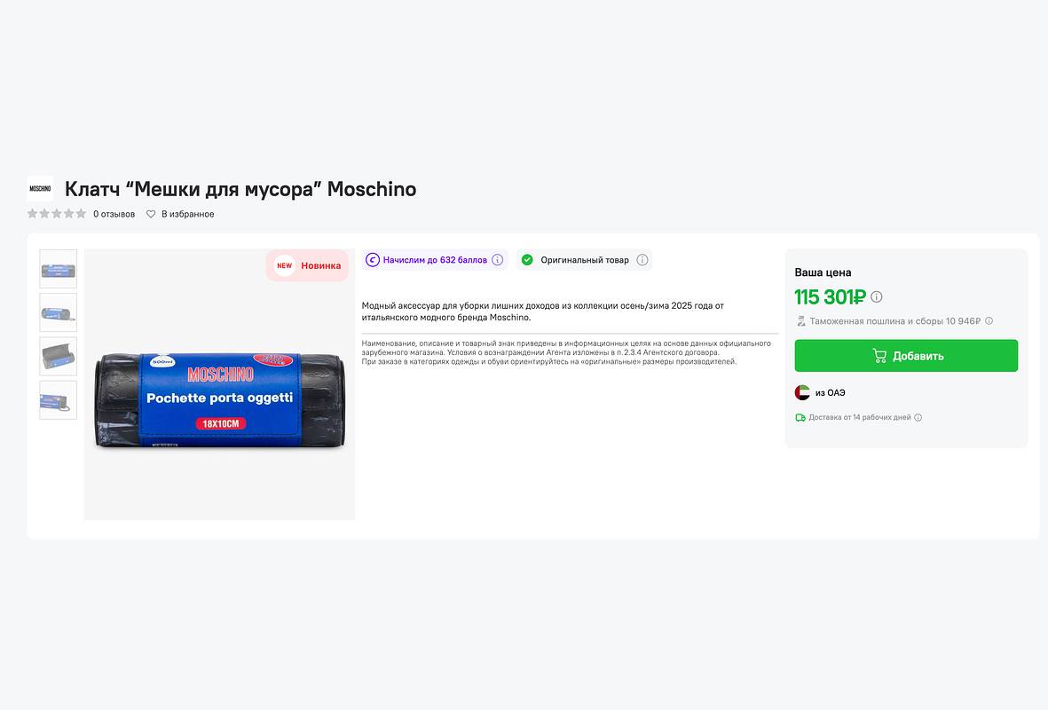 Россияне получили возможность купить клатч люксового бренда Moschino в виде мусорного мешка. Об этом «Ленте.ру» рассказали в сервисе CDEK.Shopping.