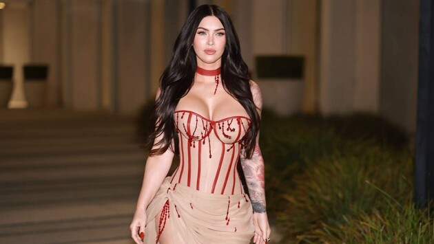 Папарацци запечатлели 39-летнюю звезду фильма «Трансформеры» на выходе с мероприятия. Она предстала перед камерами в корсетном миди-платье нюдового оттенка. Наряд с полупрозрачной драпированной юбкой был оформлен разрезом до бедра и красным декором, а также частично обнажал грудь артистки.